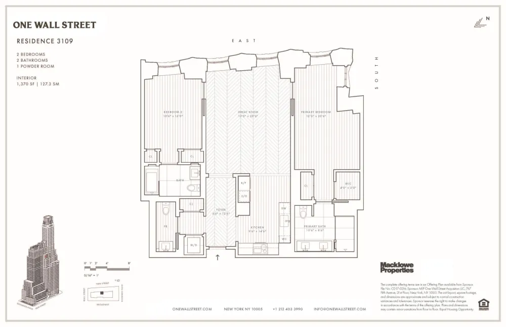 Move In Ready! Residence 3109 is a unique corner two bedroom, two-and-a-half bathroom home. Located in the Southeast corner of the building, this home has exceptional natural light, an open chef’s kitchen, and ample closet space. It is one of only three similarly styled lay outs in One Wall Street. Custom kitchens and baths pair seamless technology with classic elegance. From Kitchens featuring Aran Cucine cabinetry, best in class Meile appliances and insinkerator garbage disposal, the chef-style kitchen is the perfect blend of beauty and function.