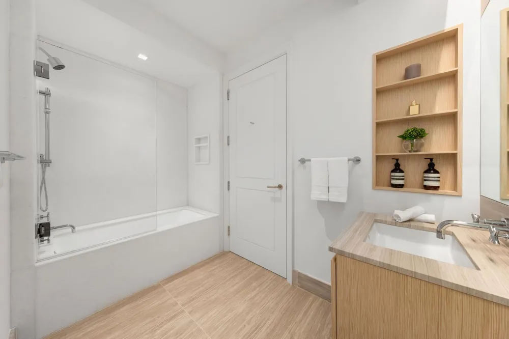 Warm stone primary bathrooms feature large stall showers with thermostatic controls. Mirrored medicine cabinets are integrated with LED lighting with Silver Romano Travertine honed floors. The building’s one-of-a-kind residences maintain the integrity and character of the 1930s scale, a modern take to art deco detailing, and boast ceiling heights over ten feet throughout with wide-plank French Oak hardwood floors underfoot.