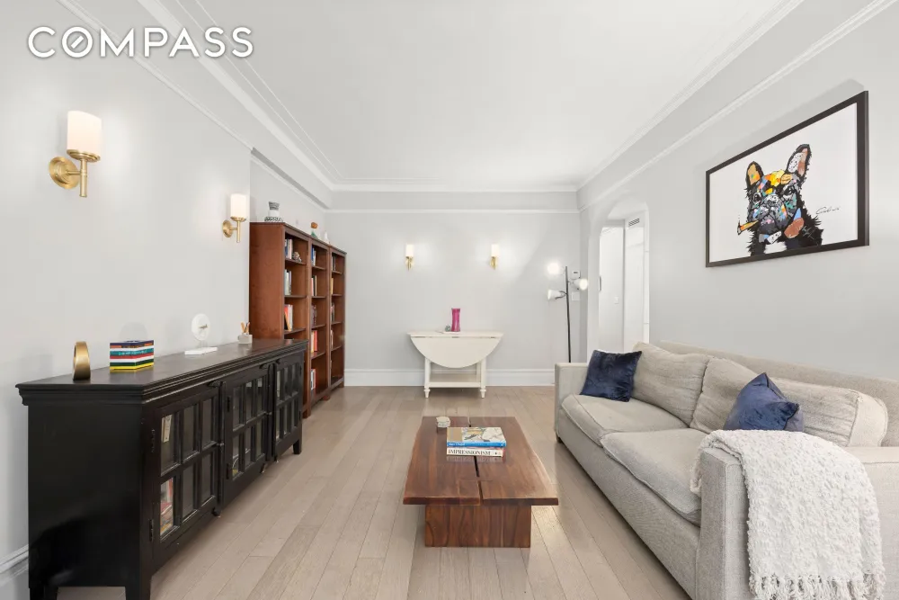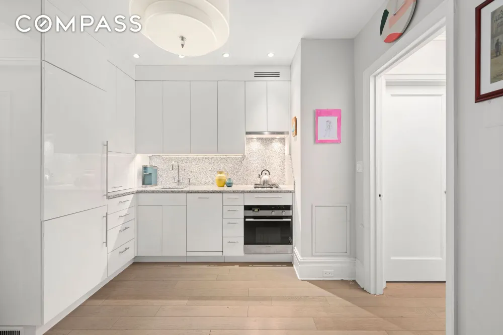 The entry gallery, equipped with two spacious outfitted closets, leads you to the fully renovated open kitchen equipped with a Liebherr refrigerator, Bosch dishwasher, Fisher and Paykel oven, sleek white lacquered cabinetry, and beautiful gray granite countertops. A beautiful arched breezeway leads to the spacious living room offering views of the lush building gardens and abundant space to accommodate comfortable living, a large dining table and rooms for a desk or home office.