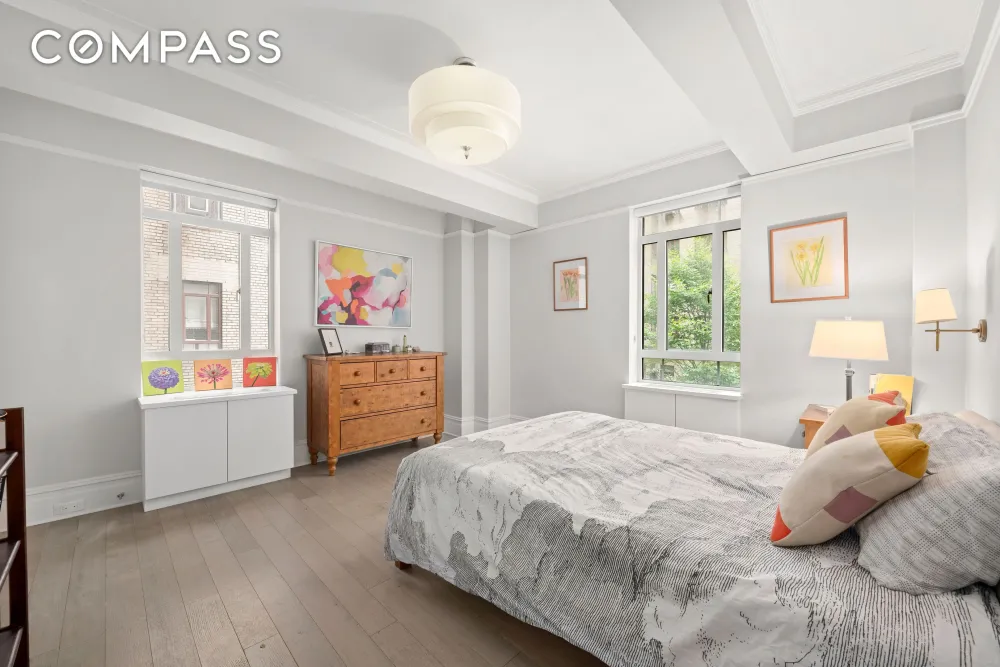 The large and tranquil corner bedroom, also facing south onto the beautiful gardens, easily accommodates a king-sized bed and additional furniture and seating and features a large, outfitted closet. The renovated, windowed bath boasts white tile floors and a stunning tile motif accenting the vanity creating a luxurious, spa-like feeling.