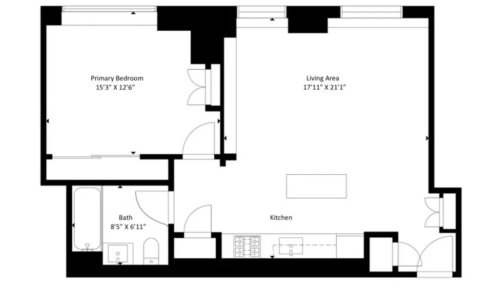 A welcoming foyer with a front hall closet leads into the expansive great room, ideal for seamless living and dining. The well-proportioned bedroom, complete with a desk area and a wall of closets, enjoys radiant natural light and open north views. The spa-inspired marble bathroom features a soaking tub, separate shower with handheld fixtures, a custom vanity, and luxurious Waterworks fittings.