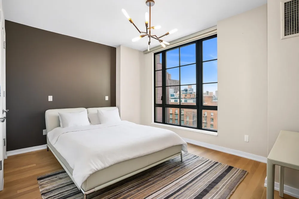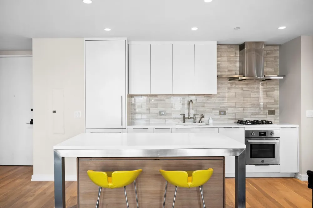Perched on a high floor, this flawless one-bedroom residence offers iconic open north-facing views of the Chrysler Building through dramatic floor-to-ceiling industrial-style casement windows. Inside, solid white oak floors, a custom dining island with rich wood cabinetry and a white quartzite countertop, and an integrated chef's kitchen with sleek white flat-panel cabinetry and silver travertine backsplash create a warm, organic elegance perfect for entertaining. Top-of-the-line appliances include a Sub-Zero refrigerator/freezer, Bertazzoni oven and gas cooktop, GE microwave, and Bosch dishwasher, along with an in-unit Bosch washer and dryer for added convenience.