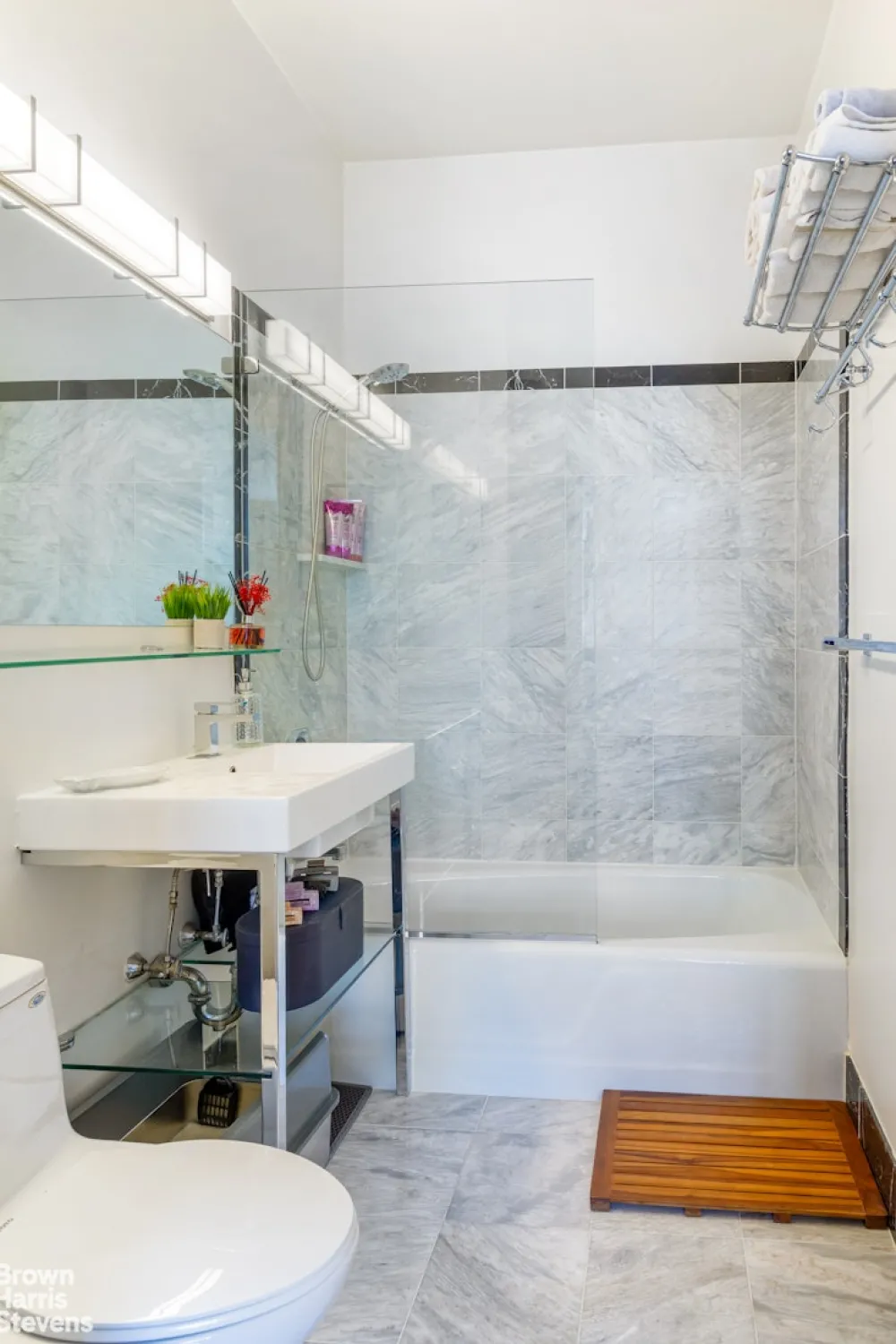 As in the living room and master bedroom, the generous second bedroom boasts a wall of floor-to-ceiling bay windows. There is a nicely proportioned closet and room for a queen size bed. The second full bathroom has beautiful marble flooring and walls, a separate closet, and soaking tub with shower combination.