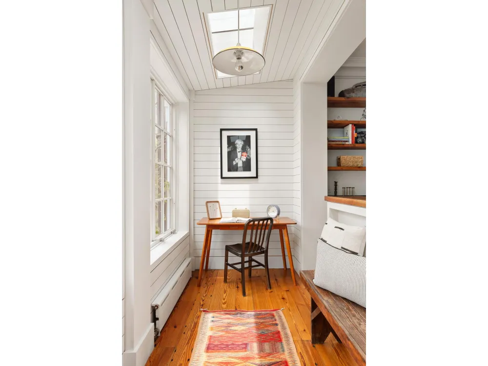 The kitchen, last renovated in 2014, is a sunlit haven overlooking the landscaped backyard. It features custom wood cabinetry, Paperstone countertops, Franke sink, and premium appliances including Liebherr, Bosch, Samsung, and Blue Star. Open shelving crafted from original 1852 studs pays homage to the home's roots. The home's original "tea room" extension remains intact and is one of the few surviving in Fort Greene.