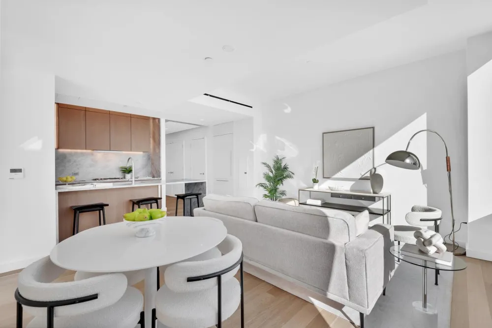 Presenting residence 3A at 611 West 56th Street. This one-of-a-kind southeast-facing corner one-bedroom, one-and-a-half-bath residence spans an impressive 868 square feet, offering refined elegance, abundant natural light, and contemporary sophistication. The coveted A-line layout is bathed in sunlight through oversized corner windows, complemented by wide-plank white oak flooring and a serene neutral palette. A discreet powder room near the entryway adds a touch of privacy for guests while entertaining.