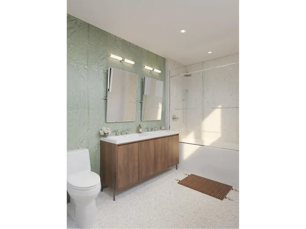 The spa-like bathroom impresses with custom tile work and a deep soaking tub. This serene oasis is elevated by polished chrome fixtures and mirrors, along with a handsome walnut vanity.