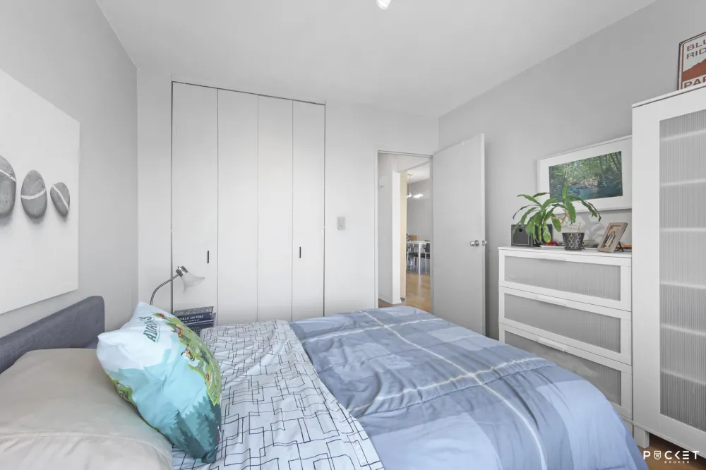 The bedroom easily accommodates a queen size bed plus bedroom furniture and is very quiet as the apartment is set back far from any street noise.