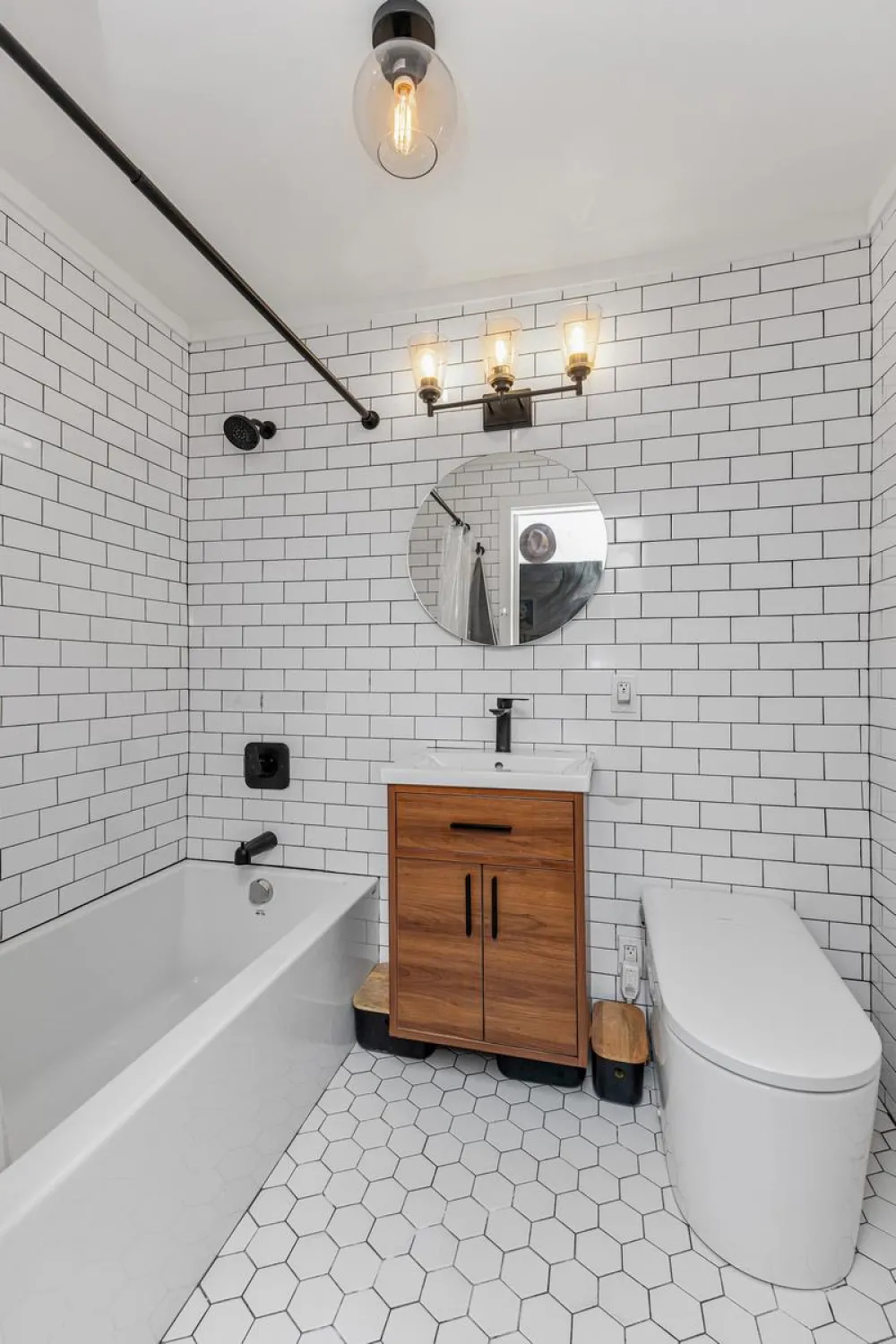 This incredible space features a fully renovated bathroom including a soaking-size bathtub and shower with custom finishes, Woodbridge elongated smart toilet, smart mirror, subway tiles and custom lighting. There is also a dressing area with a large closet and space for a dresser/additional storage. There are beautiful custom Luxury Plank Vinyl floors and custom lighting touches throughout the apartment as well as custom window treatments.