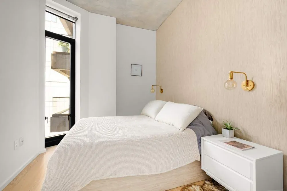 Τhis thoughtfully crafted one-bedroom retreat offers a perfect blend of comfort and refined design. The great room provides ample space for both daily living and entertaining, while every inch of the home has been curated to maximize functionality without compromising on style. Oversized, sound-attenuated 8'8" ALUMIL windows flood the space with natural light, beautifully complemented by 5" White Oak floors. Polished concrete ceilings are prepped for easy lighting installation, completing this sophisticated urban escape.