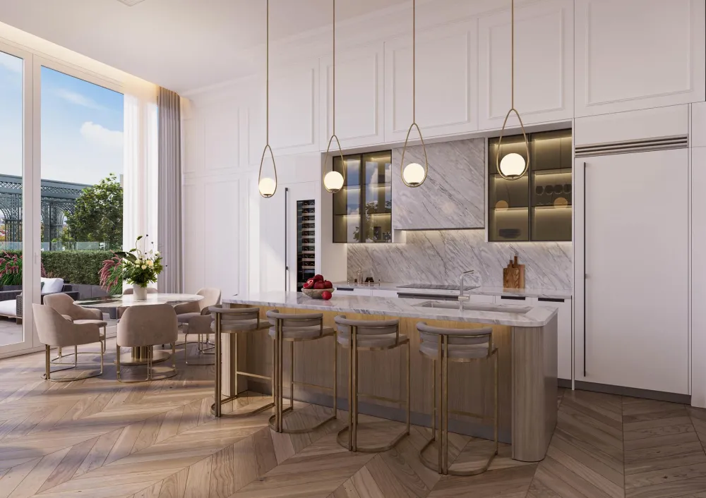 Every element is intended to elevate and enrich everyday life. You’ll appreciate the herringbone wood flooring throughout and custom Scavolini-designed kitchens with Viking appliances, including ducted outside venting range hoods and dryers. Spa-inspired bathrooms are designed to fully pamper, outfitted with deep drop-in tubs and Porcelanosa vanities with luxe Grohe faucets. The Wifi-enabled Mitsubishi split system central heating/cooling system, zoned by room, prioritizes comfort and energy efficiency tailored to your needs.