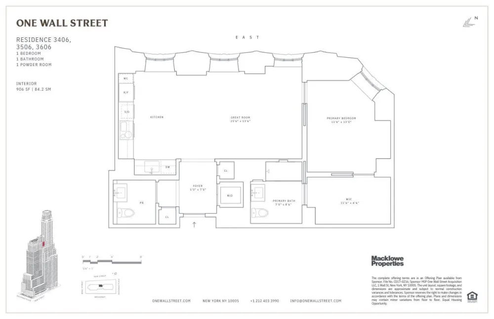 Move In Ready! Residence 3606 is a 906 SF, spacious one bedroom, one and a half bathroom layout within One Wall Street. Located in the East side of the building, with direct view of the New York Stock Exchange trading floor, this home offers ample closet space. Custom kitchens and baths pair seamless... See more