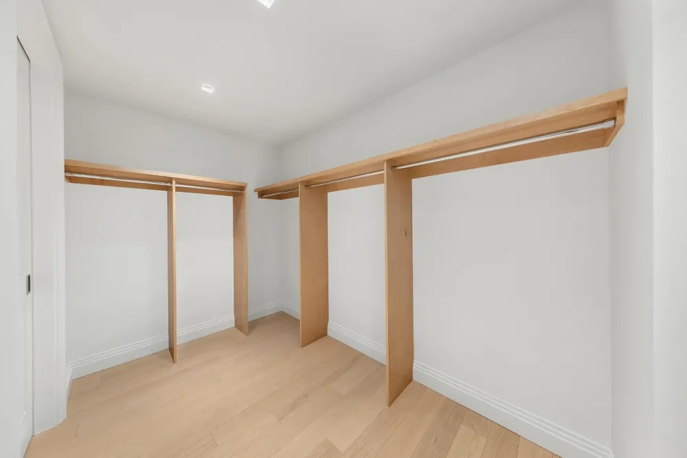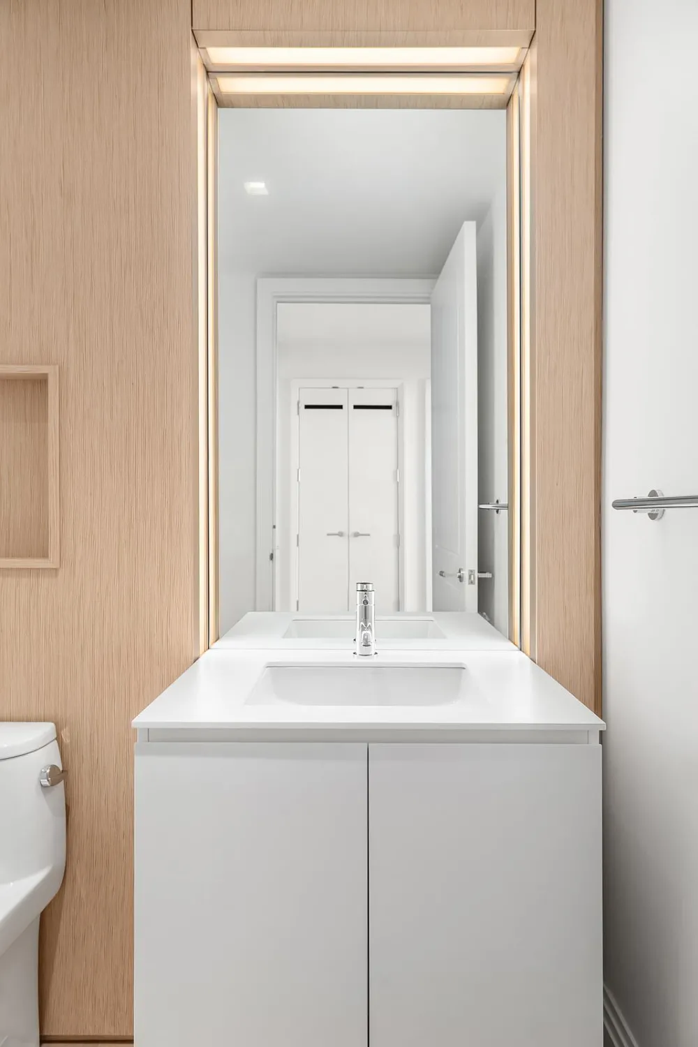 Warm stone primary bathrooms feature a soaking tub with thermostatic controls. Mirrored medicine cabinets are integrated with LED lighting and Bianco Dolomite marble surround. The building’s one-of-a-kind residences maintain the integrity and character of the 1930s scale, a modern take to art deco detailing, and boast ceiling heights over ten feet throughout with wide-plank French Oak hardwood floors underfoot.