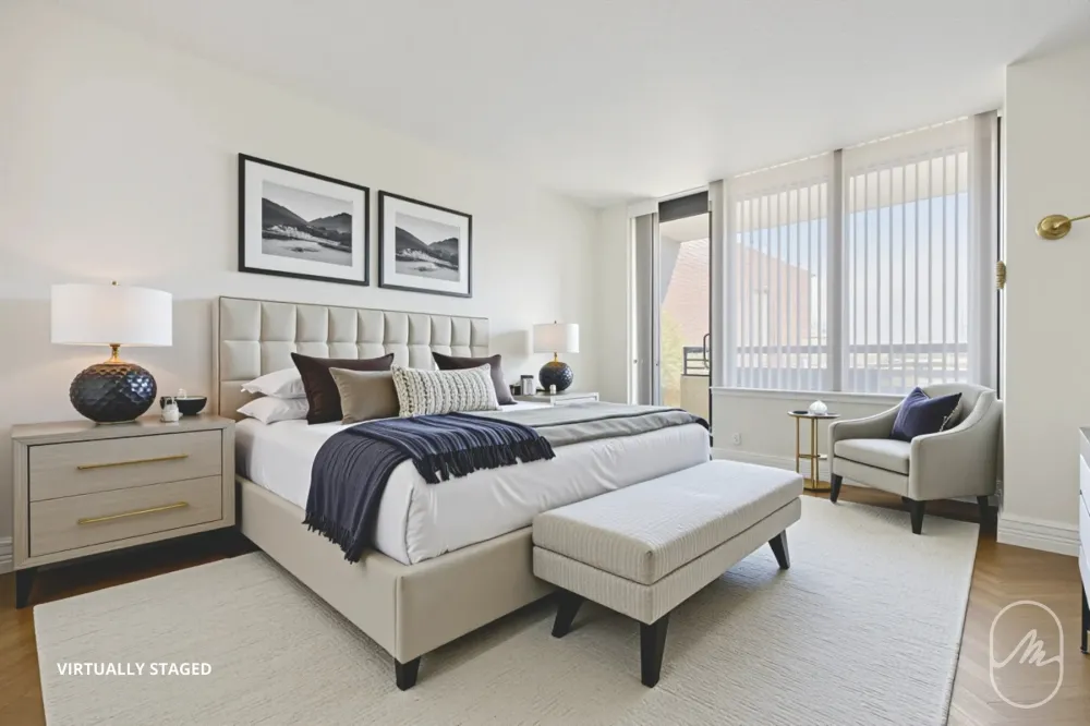 The oversized bedroom offers a peaceful retreat, complete with a private balcony and a beautifully renovated en-suite marble bathroom. The second full bathroom is equally refined and conveniently located for guests. Throughout the home, impeccable design details include herringbone hardwood floors, custom closets, and an in-unit washer and dryer.