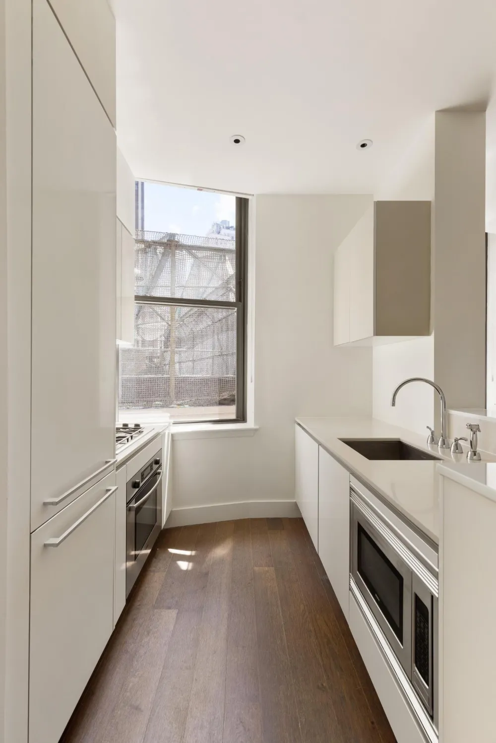 The kitchen opens to the living room, and has another window. There is tons of of storage space, Caesarstone countertops and a Lazza crystallized glass breakfast bar. The kitchen boasts Poliform cabinetry with premium appliances from Liebherr, Miele and Bosch appliances.