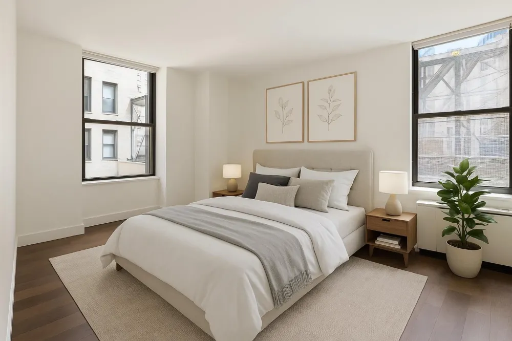 The bedroom is pin-drop quiet and fits a king sized bed and furniture. There are two spacious closets in the bedroom and two windows offering double exposure.
