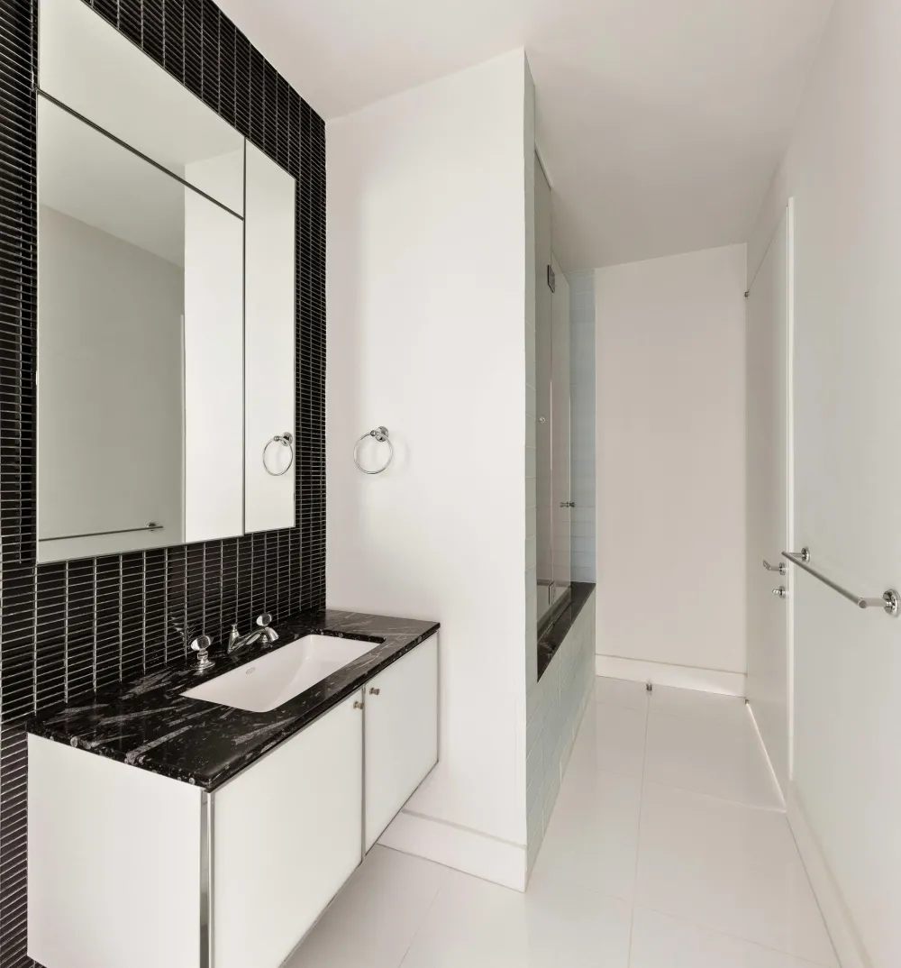 The bathroom is en-suite but also has an entrance off the front hallway, so it doubles as a powder room for guests. The bathroom has a large closet in it, Waterworks crystal fittings, marble countertops, Italian glass tiles, and a deep soaking tub.