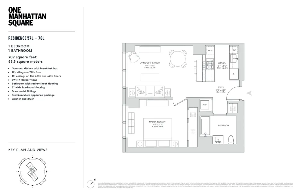 Residence 61L is a 709 square foot one bedroom, one bathroom with an open gourmet kitchen and breakfast bar. This spacious residence faces South West, with spectacular sunset views overlooking NY Harbor and the Downtown Skyline. Warm, modern interiors are brought to life by the renowned design team at Meyer Davis Studio. This residence features imported stone and custom finishes, premium Miele appliance package, 5" wide stained oak flooring, master bath with custom wood cabinetry, marble tile walls and mosaic floors with radiant heat, under-mount Wetstyle sink with glass vanity top and Dornbracht polished chrome faucets and a washer and dryer.