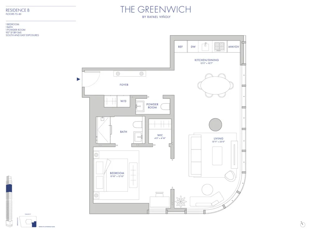 Residence 74B at The Greenwich by Rafael Vi oly is a generously sized one-bedroom, one-and-a-half-bathroom home showcasing southern and eastern exposures, revealing panoramic vistas of the illustrious Manhattan Skyline, the East River, New York Harbor, and the Statue of Liberty. Indulge yourself in the breathtaking panoramas visible through floor-to-ceiling windows, adorned with ceiling heights reaching over 10 feet, presenting an ever-evolving canvas of the city skyline and waterfront. Spanning 957 square feet, this residence offers meticulously crafted living spaces, adorned with interior finishes by the esteemed design firm, MAWD.