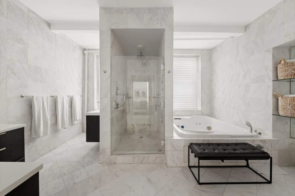 The primary suite is a private sanctuary featuring direct terrace access, a custom-fitted walk-in closet, and a spa-inspired five-fixture marble bath with a deep soaking tub and separate shower. A second bedroom offers an en-suite bath and a spacious closet just outside the room, while a third bedroom includes private terrace access and a walk-in closet. A home office, set just off the living room and overlooking the terrace, provides versatility and can easily be transformed into a fourth bedroom.