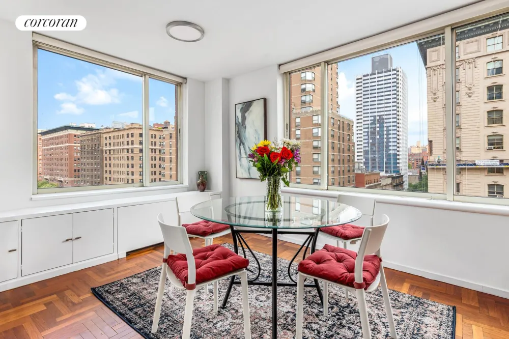 Directly off the foyer, Its large east facing living room is sun drenched all morning, and flows into the dining room with its corner windows, can be used as an office or a third bedroom.