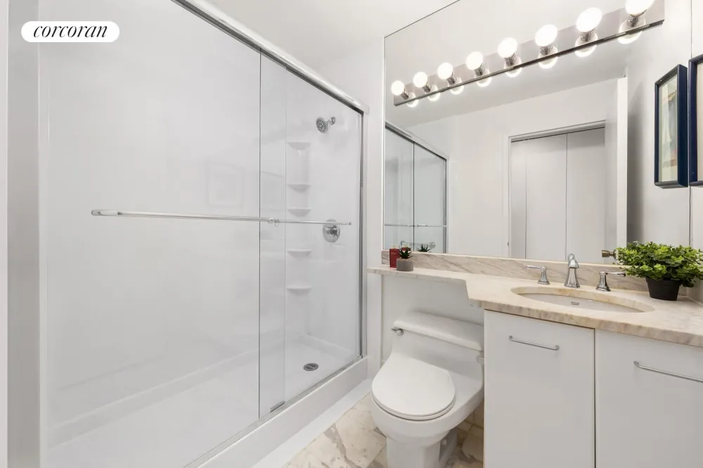 The primary bedroom suite includes several closets, a large north facing window can accommodate a king size bed and a whole bunch of furniture like a desk or a seating area. the main bedroom has an en-suite bath with glassed in shower and marble countertops and marble floors.