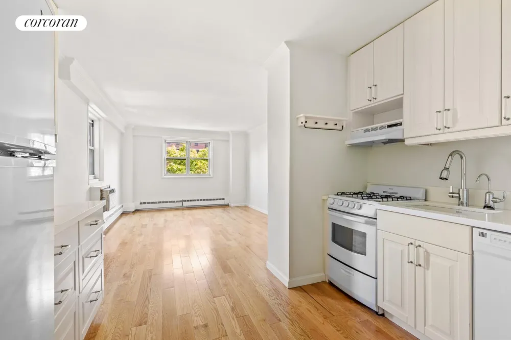 The flexible layout easily accommodates a queen-size bed, a generous living area, and a dining nook. Storage is exceptional, with a massive walk-in closet, a coat closet with built-in lighting, and additional cabinetry. The bathroom includes a deep soaking tub with a rejuvenating shower, an updated vanity and toilet, and a large mirrored medicine cabinet. Rich hardwood flooring runs throughout.