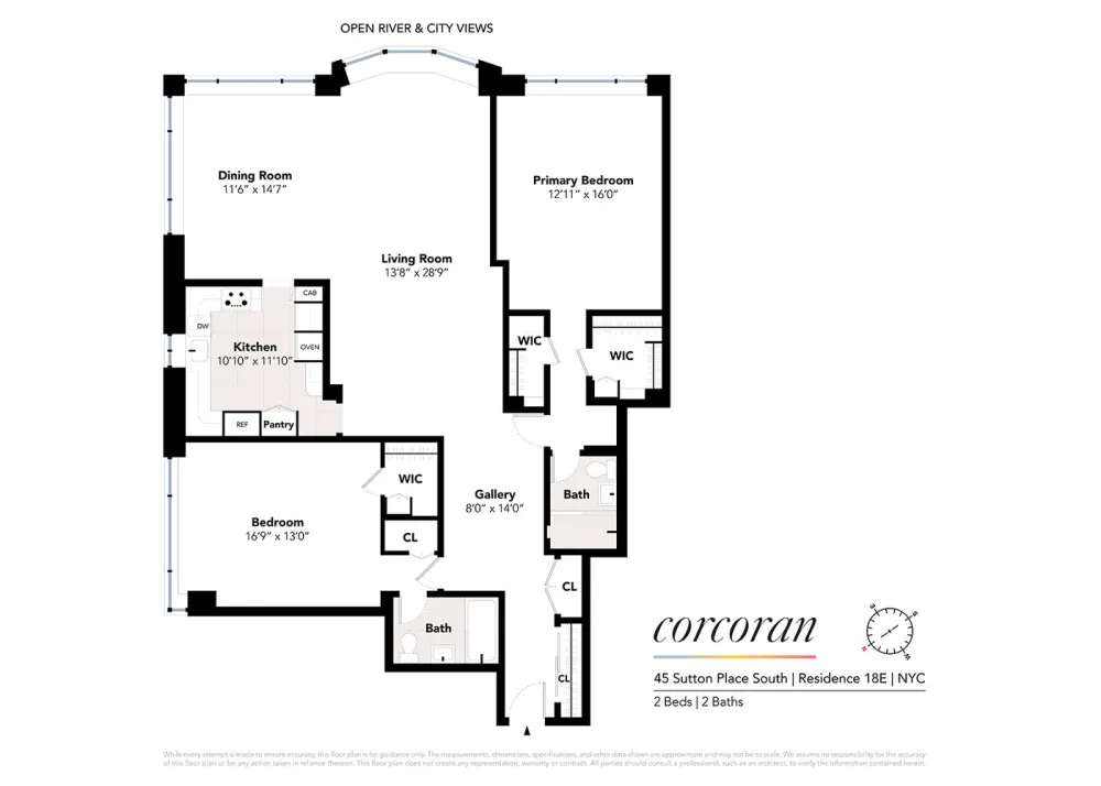 Welcome to 45 Sutton Place South, 18E, a 2 bedroom 2 bath home where elegance meets modern comfort with stunning open views of the East River and exposures East, North and South of some of the city's iconic landmarks. This 18th floor rarely available E line offers a spacious layout featuring a charming bay window in the living room, a large, windowed kitchen, two just-renovated bathrooms, white oak flooring, excellent closet space, all well-maintained and in excellent condition. Enjoy the magnificent views from the moment you open the door and step into the gallery. You'll capture the beauty of the river and bridges right from your living room, corner dining room, and primary bedroom. The peaceful primary bedroom suite with ensuite newly renovated bathroom features two huge closets. The second bedroom with adjacent full bath, which can also serve as a powder room for guests, has two large closets. In every room, you'll find the comfort of a/c and heating controls (electric included in maintenance) and the option for in-unit laundry, enhancing your living experience.