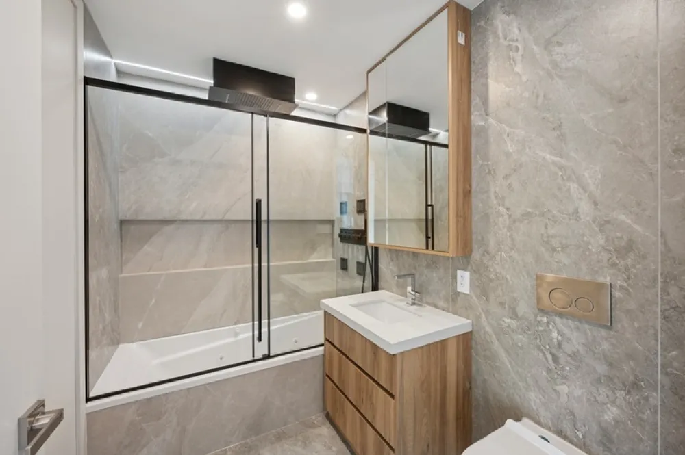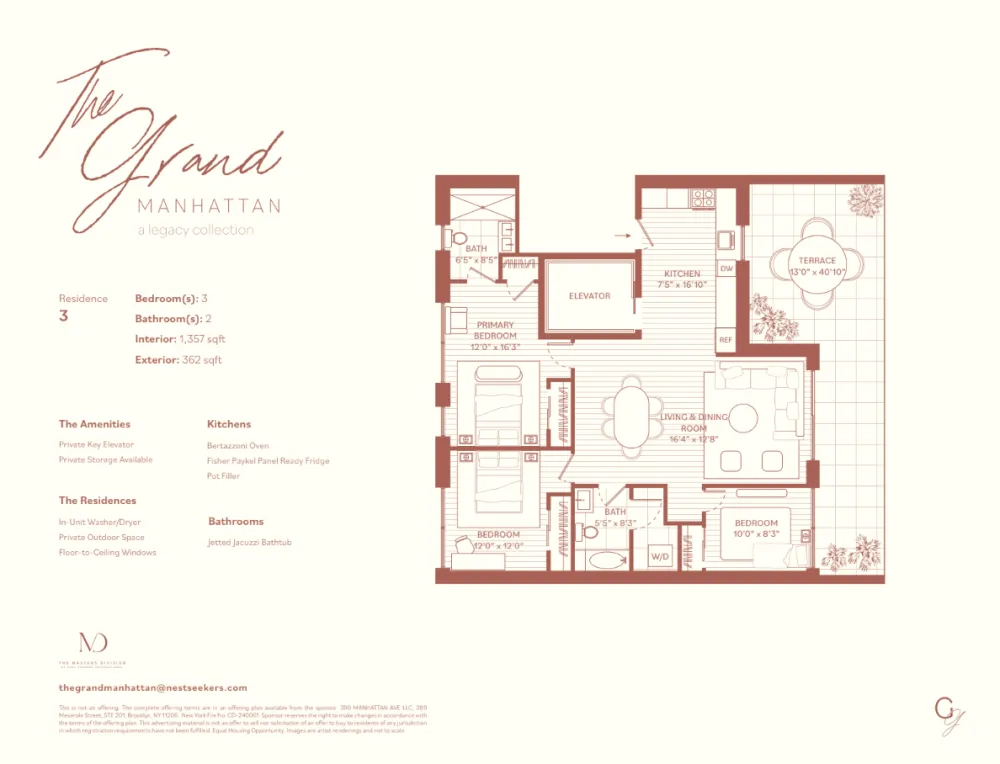 **COMES WITH A PRIVATE CABANA** Step into luxury living at The Grand Manhattan, where this three-bedroom, two-bathroom residence offers the ultimate in comfort, style, and exclusivity. Located at 390 Manhattan Avenue, this meticulously designed home seamlessly blends modern sophistication with the vibrant energy of Greenpoint. Boasting a spacious, open-concept layout, this home is flooded with natural light thanks to its oversized windows and soaring ceilings. The European white oak flooring creates a warm and inviting atmosphere throughout, while thoughtfully designed spaces ensure both comfort and elegance. The residence boasts a private terrace, providing seamless access to outdoor living and a perfect space for relaxation or entertaining. Whether you're savoring your morning coffee, unwinding with a good book, or dining al fresco with friends, this private terrace offers the perfect setting to relax, entertain, and soak in the surrounding views. The chef-inspired kitchen is a true showpiece, featuring custom cabinetry, ultra-durable Dekton countertops, and a suite of high-end appliances, including a Bertazzoni oven, panel-ready Fisher & Paykel refrigerator, and a built-in water dispenser for effortless pot filling and seamless cooking. Both bathrooms are spa-inspired sanctuaries, fully clad in sleek tile and outfitted with premium fixtures. The primary en-suite bath offers an indulgent jetted jacuzzi tub, creating a tranquil escape from the bustle of city life. An in-unit washer and dryer ensure effortless daily living, while a secure video intercom system provides peace of mind. Additional caged storage is available for purchase, offering practical solutions for urban living. Set in the heart of Greenpoint, The Grand Manhattan is surrounded by trendy cafe´s, acclaimed restaurants, and boutique shopping, all while being just moments from McCarren Park’s lush green spaces, running trails, and recreational facilities. With the G and L subway lines nearby, commuting to Manhattan or exploring Brooklyn’s vibrant neighborhoods is effortless, making The Grand Manhattan the perfect residence for those seeking both connectivity and exclusivity. *Taxes shown represent savings with the NYC Condo & Co-op 17.5% Tax Abatement*