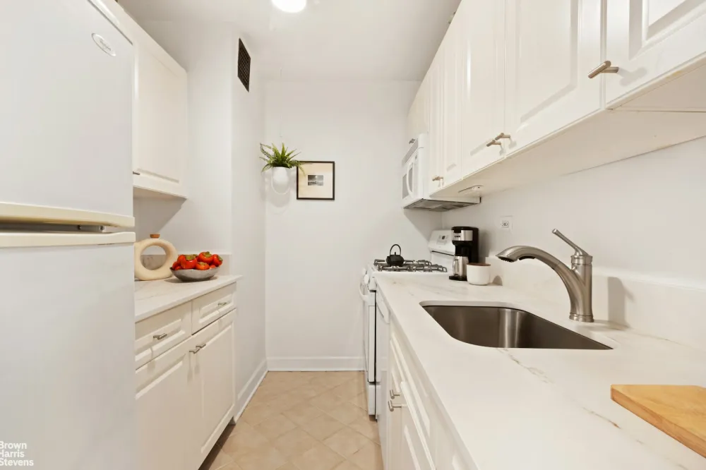 The thoughtfully designed layout provides distinct spaces for living, dining, and working, with a large alcove that comfortably fits a queen-size bed. The renovated galley kitchen features sleek quartz countertops, a deep stainless steel sink, and modern fixtures. The updated bathroom-complete with a soaking tub-adds a touch of spa-like serenity.