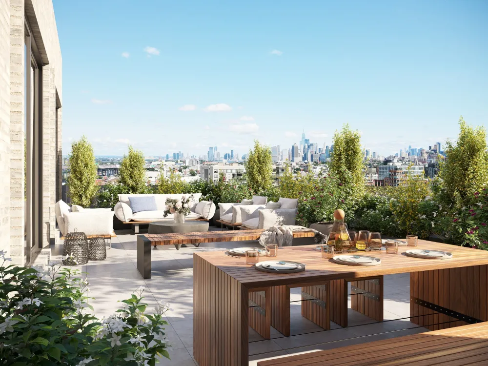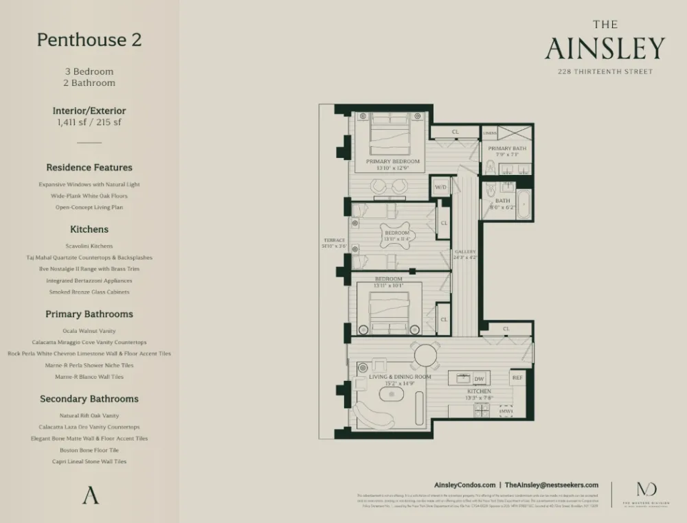 Introducing PH2, a stunning penthouse at The Ainsley that spans 1,411 square feet of interior space with expansive private terraces offering breathtaking views. This 3-bedroom, 2-bathroom home embodies the pinnacle of luxury living, with meticulously curated finishes and spacious layouts that cater to a refined lifestyle. The open-plan living and dining area is framed by floor-to-ceiling windows, allowing sunlight to flood the space while providing direct access to a large terrace perfect for outdoor dining, lounging, or entertaining. The kitchen is designed for the modern gourmet, with custom Scavolini cabinetry imported from Italy, Taj Mahal quartzite countertops and backsplash, Ilve Majestic induction range in white with brass trims imported from Italy, and a suite of integrated appliances including a panel-ready refrigerator and dishwasher. The sleek, contemporary design of the kitchen pairs beautifully with the natural light and open layout of the home. The king-sized primary bedroom features access to an oversized balcony, a walk-in closet, and a luxurious en-suite bathroom with chrome fixtures, luxurious Vive tiles imported from Spain, and a glass-enclosed walk-in shower. Two additional bedrooms offer flexibility for a home office, guest accommodations, or family use. The second bathroom is equally well-appointed, featuring high-end finishes and ample storage. A full-size washer/dryer is discreetly tucked away, adding to the home’s practicality. The Ainsley offers an unmatched living experience with over 10,000 square feet of amenities, including a fitness center, residents’ lounge, children’s playroom, and a rooftop terrace with panoramic views. Located in the heart of Park Slope, The Ainsley is steps from Prospect Park, boutique shops, and some of the city’s finest restaurants. With nearby subway access, commuting to Manhattan is seamless, making this penthouse the perfect combination of luxury and convenience.