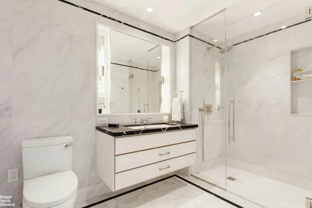 The primary bathroom is finished in honed Pacific White Marble with Calacatta Black marble countertops, a glass-enclosed walk-in shower, and radiant heated floors. The powder room makes a distinct statement with Breccia Capraia marble walls and custom bronze details.