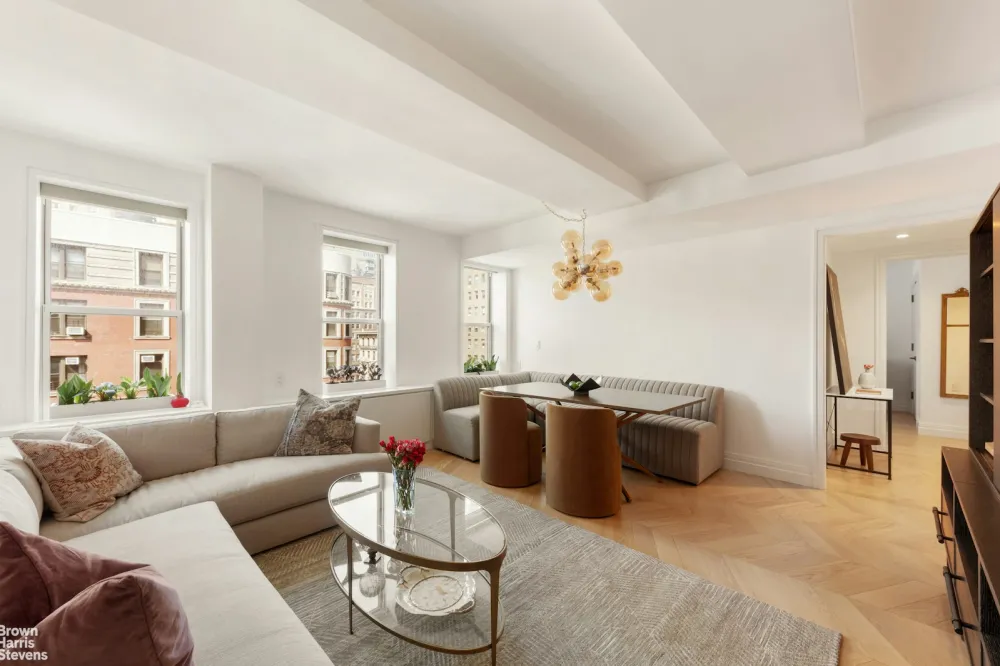 Interior highlights include white oak chevron floors, restored tray ceilings, and bespoke millwork that pay tribute to the building's original 1920s character. The chef's kitchen is outfitted with Naica Quartzite countertops, American walnut cabinetry with fluted glass accents, and a full Miele appliance suite, impeccably curated by renowned designer Nancy Ruddy.
