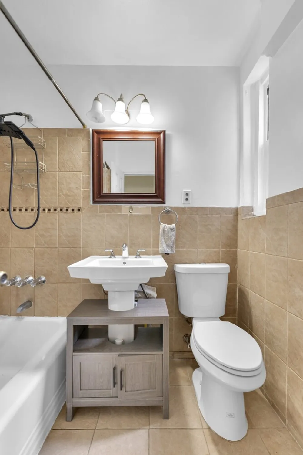 The spacious king-size bedroom provides a tranquil retreat with treetop views and a deep walk-in closet. The bathroom is tastefully finished with classic tilework, a pedestal sink, and a full tub. Ample closets and a smart, flowing layout round out this inviting residence.