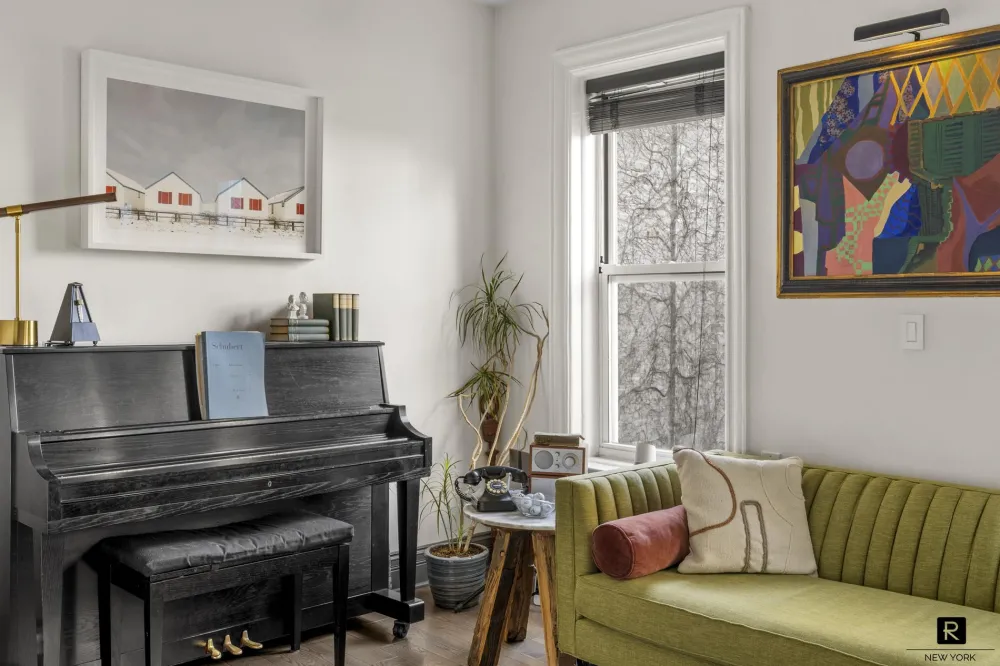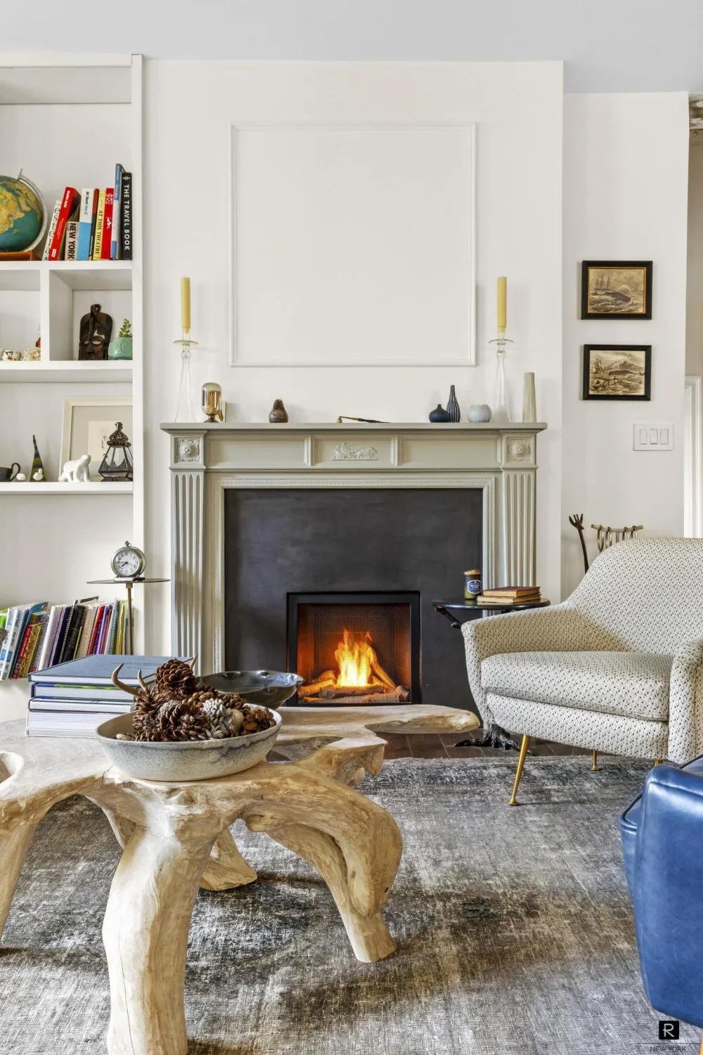 Step inside to an airy layout where a generous dining room flows naturally into a light-filled living area . High ceilings, original architectural details, and wide-plank oak floors set the stage for both relaxed evenings and memorable entertaining. Additional features include a sleek Hearth Cabinet ethanol fireplace, custom built-ins, and oversized windows and 9’2” of ceiling height that welcome in steady northern light.