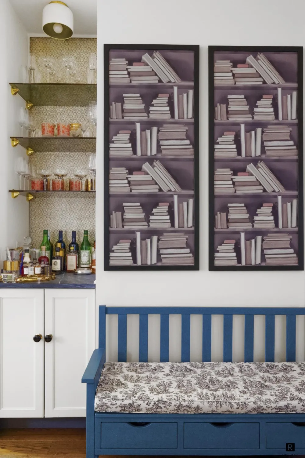 The two bedrooms are quietly tucked away for privacy, each with abundant closet space. The primary suite includes a gut-renovated, spa-inspired bath with a walk-in shower, as well as an in-unit Bosch washer and dryer, while the second full bathroom features stylish tilework and designer wallpaper.