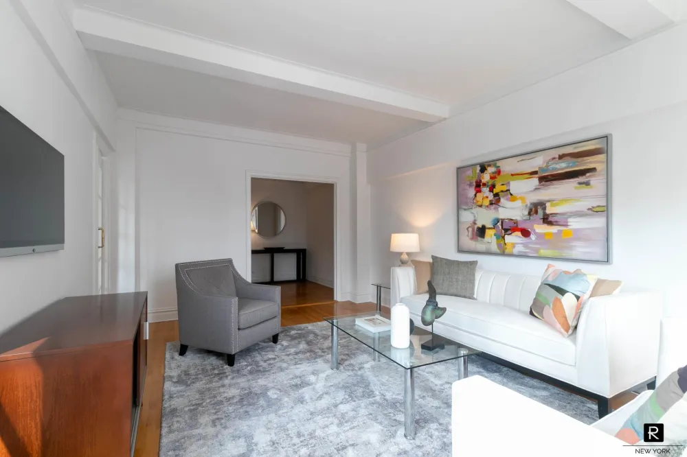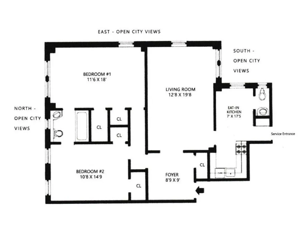 Apartment 12E is entered through a gracious foyer that leads to a well-proportioned living room. There are two large bedrooms, both with excellent closet space, and they share an adjoining full bathroom. A second half bathroom is located off the kitchen. There is room for a dining area in the spacious kitchen which has a separate service entrance.