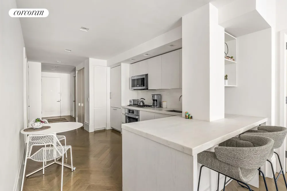 The elegant open concept chef's kitchen with top-of-the-line appliances has storage abound and a custom island. It features white oak wood finished cabinetry, beautiful marble countertops, and a full suite of stainless steel Bosch appliances.