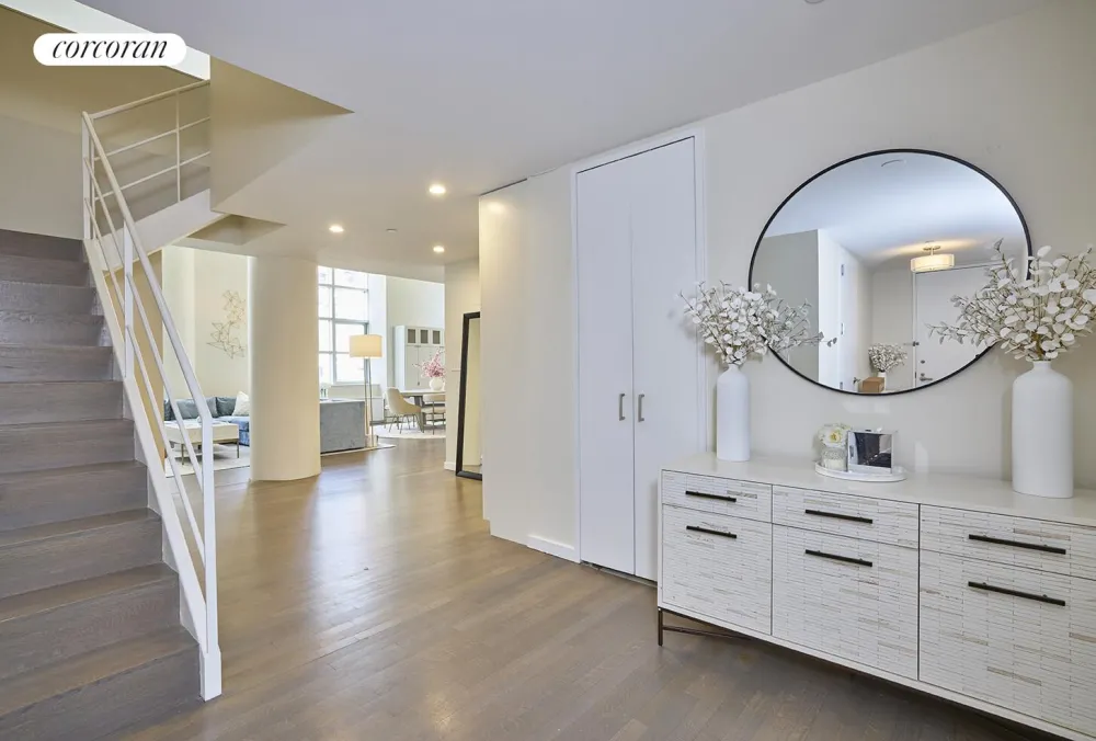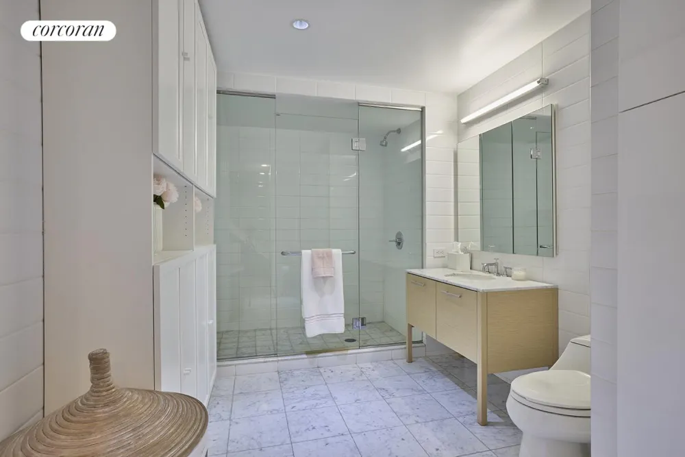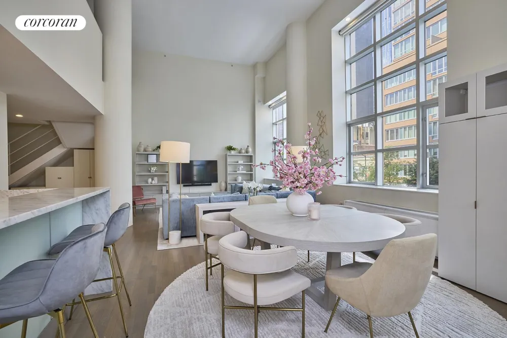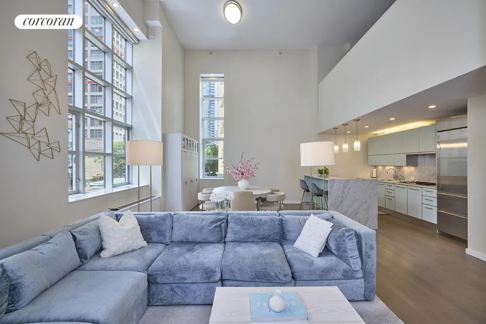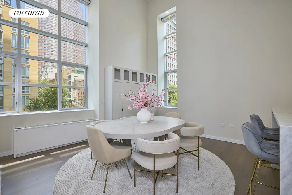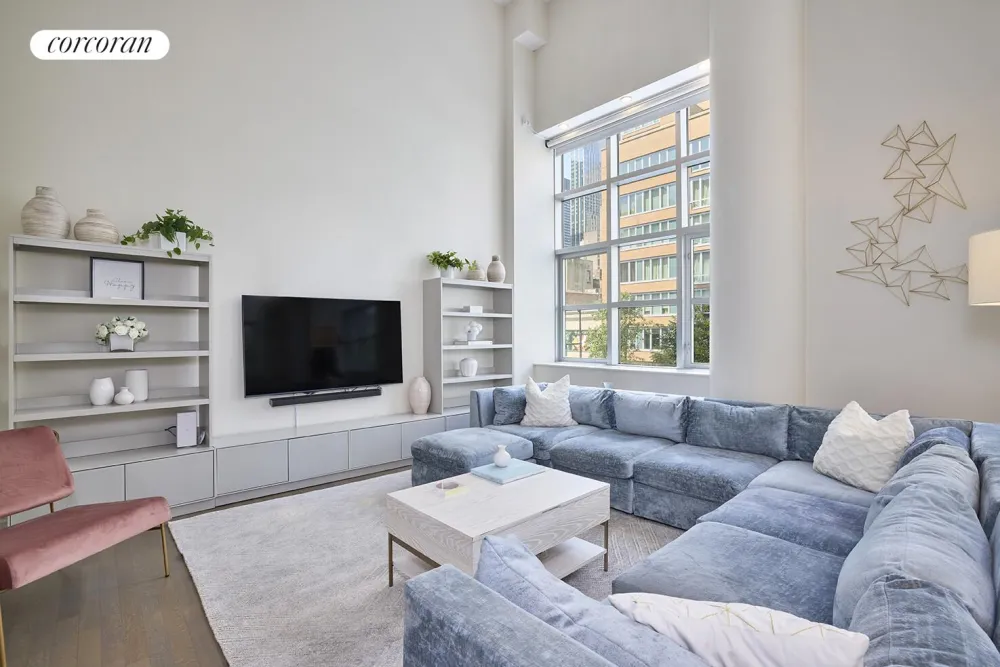 This stunning corner home with soaring 18' ceiling height spans over 1670 square feet and has recently been refreshed with newly refinished wide French oak floors, new electronic shades, beautiful builtins, and California Closets. It boasts great midtown views, enormous windows, generous light, and sleek finishes throughout which make a dramatic impression.