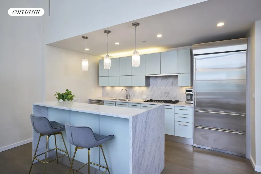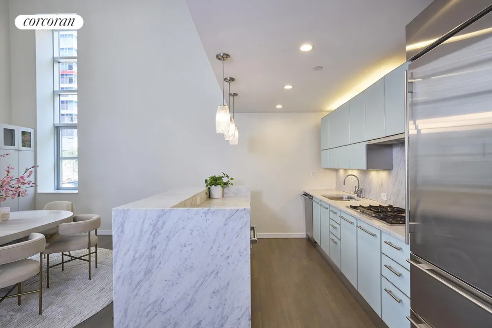 The impressive main level is ideal for entertaining marked by towering ceilings and an open-concept layout for seamless living and dining. The contemporary open kitchen is well-equipped for the home chef featuring a Gaggenau range, Thermador Oven, and SubZero Refrigerator. The lower level features room for a 2nd bedroom, home office area, added storage, and beautiful full bath. Full size vented LG washer and dryer complete the lower level. Take the stairs to the private second level which is reserved for your primary bedroom. Adjoining the primary bedroom is an indulgent marble-clad bathroom offering dual sinks, exceptional vanity and medicine cabinet storage, and a soothing soaking tub/shower.