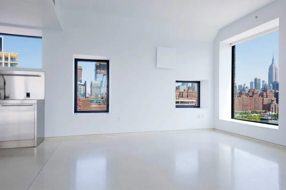 The space of 16C, a high floor consisting of approximately 2650+/-sf with 3 bedrooms, and 3.5 baths, attests to Nouvel's singular achievement with South-West, East and North exposures. The sparse and clean design accentuated by the white terrazzo floors running throughout the unit, provides a gallery like setting in which to accept the unpredictable placement of windows to its east and north with the surprise element of framed "postcard photos" of New York City's skyscrapers, including the Empire State Building and the Met Life Building.