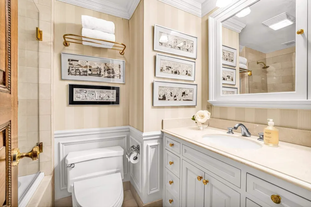 The generous primary suite includes a large walk-in closet, additional built-in storage, and a spacious marble bathroom with double sinks and a walk-in shower. The secondary bedroom, currently used as a library/office, features custom built-ins and an en-suite marble bath.