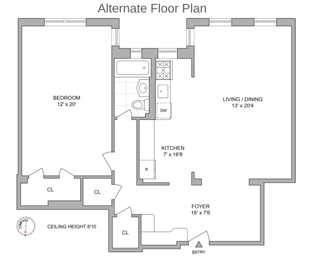 Embrace the Art-Deco charm in this 902SF, South-facing corner 1BR residence. A large entry foyer provides space for any and all accoutrements, and can easily double as office space. The galley kitchen is spacious, and could easily be opened to the living space (see alternate floor plan), while the adjacent living room is large enough for seating and a dining area. Off the foyer, a hallway with two large closets leads to an enormous bedroom and a windowed bathroom. It is rare to find a 1BR unit with this much space!