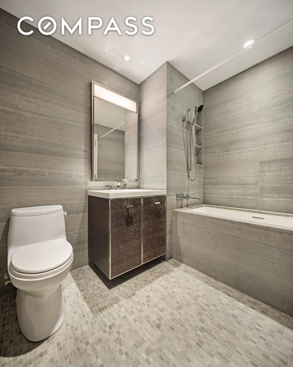 The spacious bedroom comfortably fits a queen-size bed and includes generous closet space, while floor-to-ceiling windows flood the room with natural light and showcase stunning city and river views. The spa-inspired bathroom is appointed with marble tile walls, mosaic floors with radiant heat, custom wood cabinetry, an under-mount Wetstyle sink with a glass vanity top, and Dornbracht polished chrome fixtures. A full-size washer and dryer add convenience to this well-planned residence.