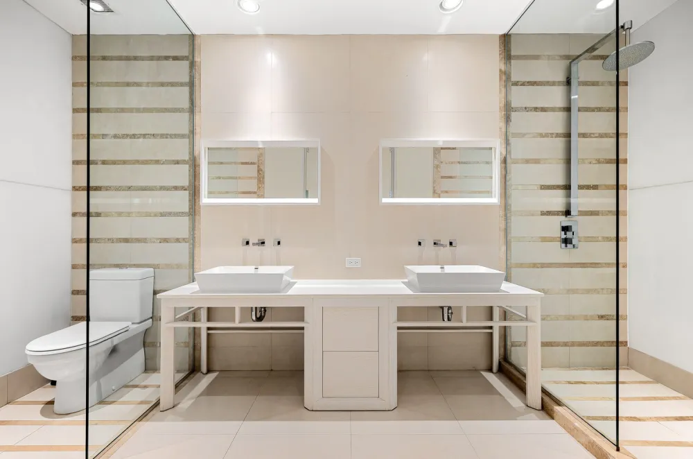 This spacious residence features soaring 12-foot ceilings and oversized windows that flood the space with natural light. The home offers spa-like bathrooms with double vanities and a versatile den that can serve as a guest room, second bedroom, or home office.