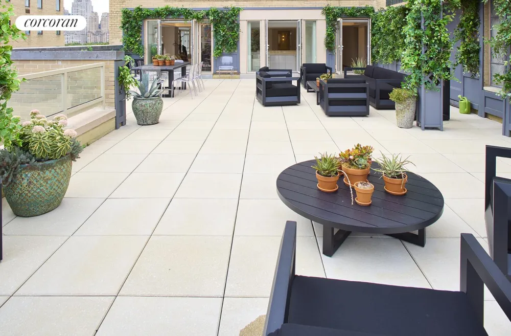 Inside, glamorous style meets thoughtful design. The expansive living and dining areas flow effortlessly across wide-plank white oak floors, illuminated by recessed Element lighting and anchored by a custom backlit onyx bar-a striking centerpiece for entertaining. The open-plan layout extends naturally to the vast terrace through 3 sets of French doors. This a truly rare Fifth Avenue sanctuary with endless possibilities for al fresco dining, lounging, and gatherings under the city skyline.