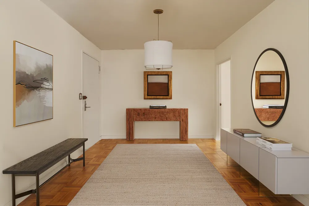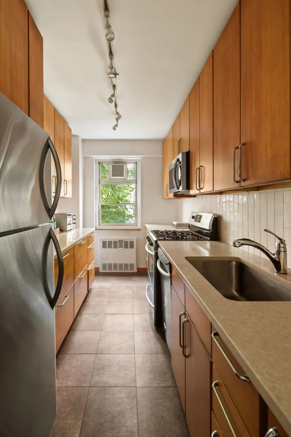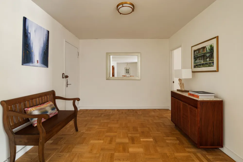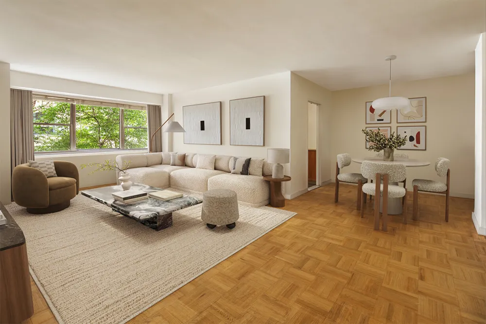 Residence 3K at 70 East 10th Street spans approximately 1,058 square feet, offering a gracious one-bedroom, one-bath layout that blends comfort, space, and natural light.An exceptionally large entry foyer with abundant closets opens to a sun-filled living and dining room framed by a wall of windows overlooking the building's landscaped garden. With southern and western exposures, this home is a serene oasis in the middle of downtown Manhattan. The windowed kitchen is outfitted with stainless steel appliances, custom cabinetry in a natural finish, granite countertops, and a tile backsplash.