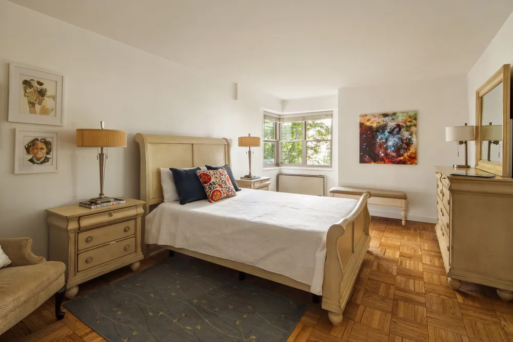 The king-sized primary suite is bright, pin-drop quiet, and offers plenty of room for additional furnishings or a dedicated work-from-home space. Two custom closets, including a walk-in with adjustable shelving, provide outstanding storage. The bathroom features white subway tile, a pedestal sink, soaking tub, and tile flooring in timeless style. Additional highlights include beautiful parquet floors throughout and a recently upgraded, energy-efficient wall-through AC/PTAC unit in the living room.