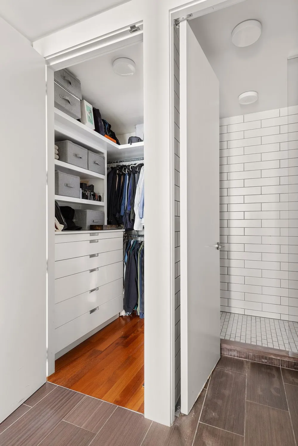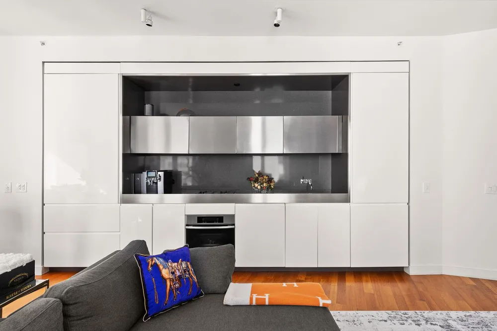 This corner residence boasts floor-to-ceiling windows and soaring ceilings, flooding the home with natural light and offering sweeping city views. The open-plan living and dining area is ideal for entertaining, with a chef’s kitchen featuring custom cabinetry, Caesarstone countertops, and top-of-the-line appliances by Miele, Gaggenau, and Sub-Zero.