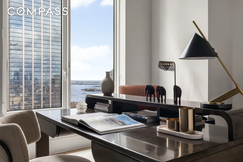 The duplex spans 2,265 square feet and has three bedrooms, three and a half bathrooms, an enormous double-height living area, foyer, dining area, closed kitchen, and significant closet space. All windows face south or east, for incredible light all day and spectacular New York views.