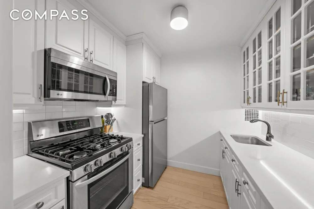 The flexible layout offers a separate sleeping alcove, easily convertible into a true one-bedroom, while the spacious living and dining area provides the perfect setting for both relaxation and entertaining. Custom shelving has been added to the walk-in closet for enhanced organization, and a recently replaced through-the-wall AC unit ensures year-round comfort. The well-appointed separate kitchen enhances both style and functionality, and with two oversized closets, storage is effortless.